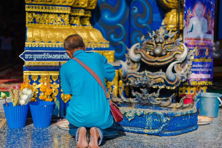 蓝色代表天空、大海和无限的智慧,也让人心生平静,即使信众和僧侣往来,整座寺庙依然给人安静平和的感觉。