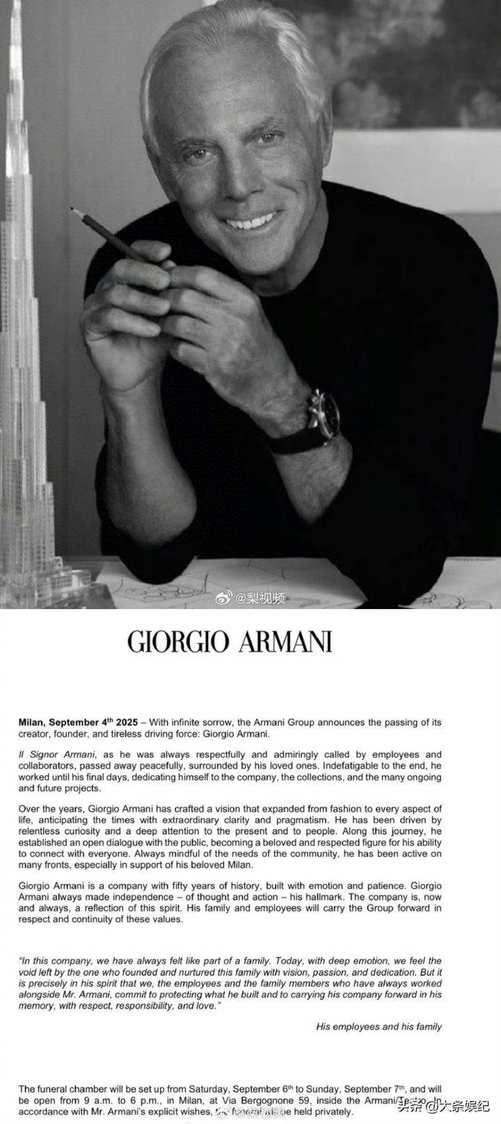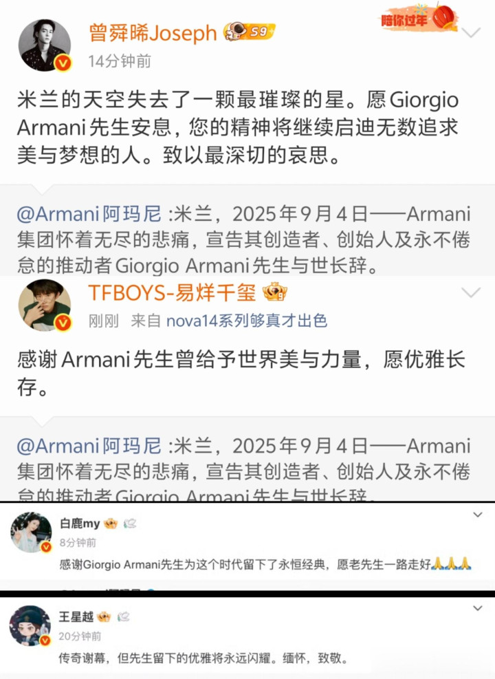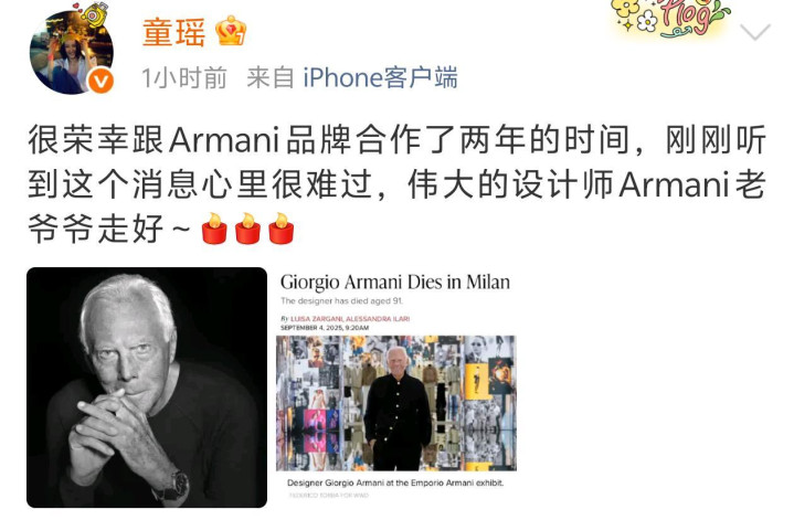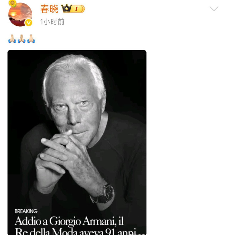 突发讣告! 乔治·阿玛尼去世! 章子怡易烊千玺白鹿童瑶发文悼念