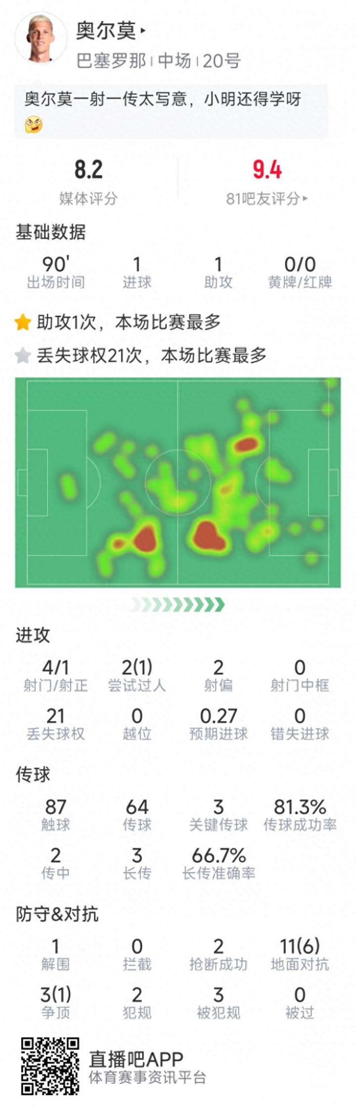 奥尔莫本场数据: 1球1助攻, 4射1正, 3次关键传球, 2次抢断