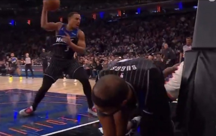 直播吧12月09日讯尼克斯106-100主场战胜魔术的比赛中,贝恩曾在一次快攻中,拿球怒砸OG,最终吃到技犯。